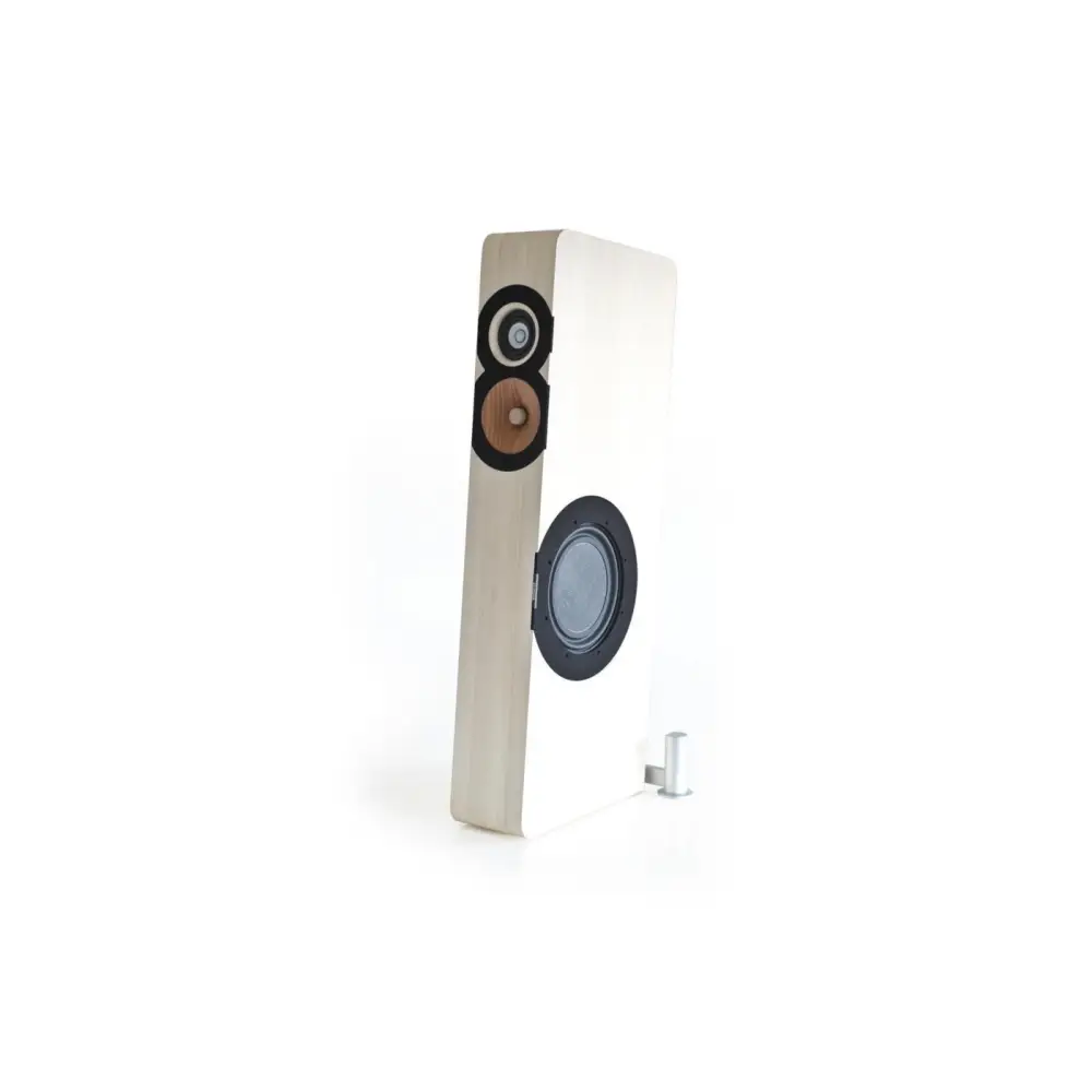 - 6″ custom-made woodcone bass-midrange driver, 1st order low pass filter, no high pass filter, ash tree phase plug, magnet structure force fit mounted to the whole wooden mass of enclosure.
