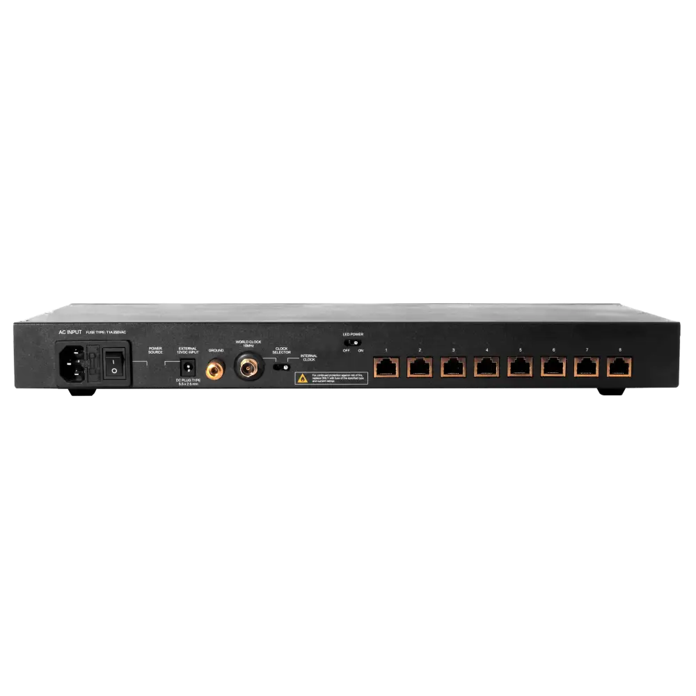 Widened LAN port spaces effectively avoid the physical signal interference, more professionally, N8 Pro comes with 2 versions, one owns both Silent Angel's specialized TCXO module and a BNC external 10MHz world clock interface to make the applications far more flexible to suit your existing audio setup; another one solely supports Silent Angel's specialized TCXO module.